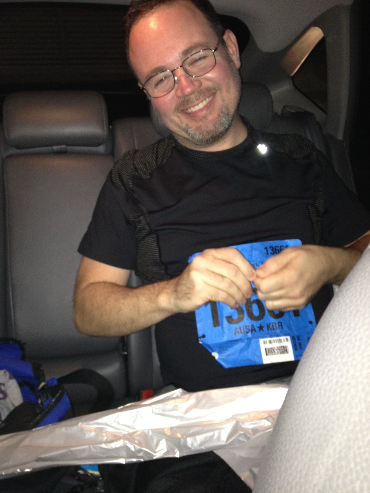 Becky and myself were yelling out our goodies to all of the runners. At times I felt like I was working at a carnival trying to get people to throw a dart at the balloon. It was lots of fun. I was tracking some runners and was also on the lookout for them as I was yelling about my swedish fish and sour patch kids. At one point someone ran past yelling my name. I couldn't place who it was and then he yells his name. It was Mark who Megan and I met at the Marine Corps Historic Half in June. We had dinner with him and his wife. It was great yelling to him "Good Luck"